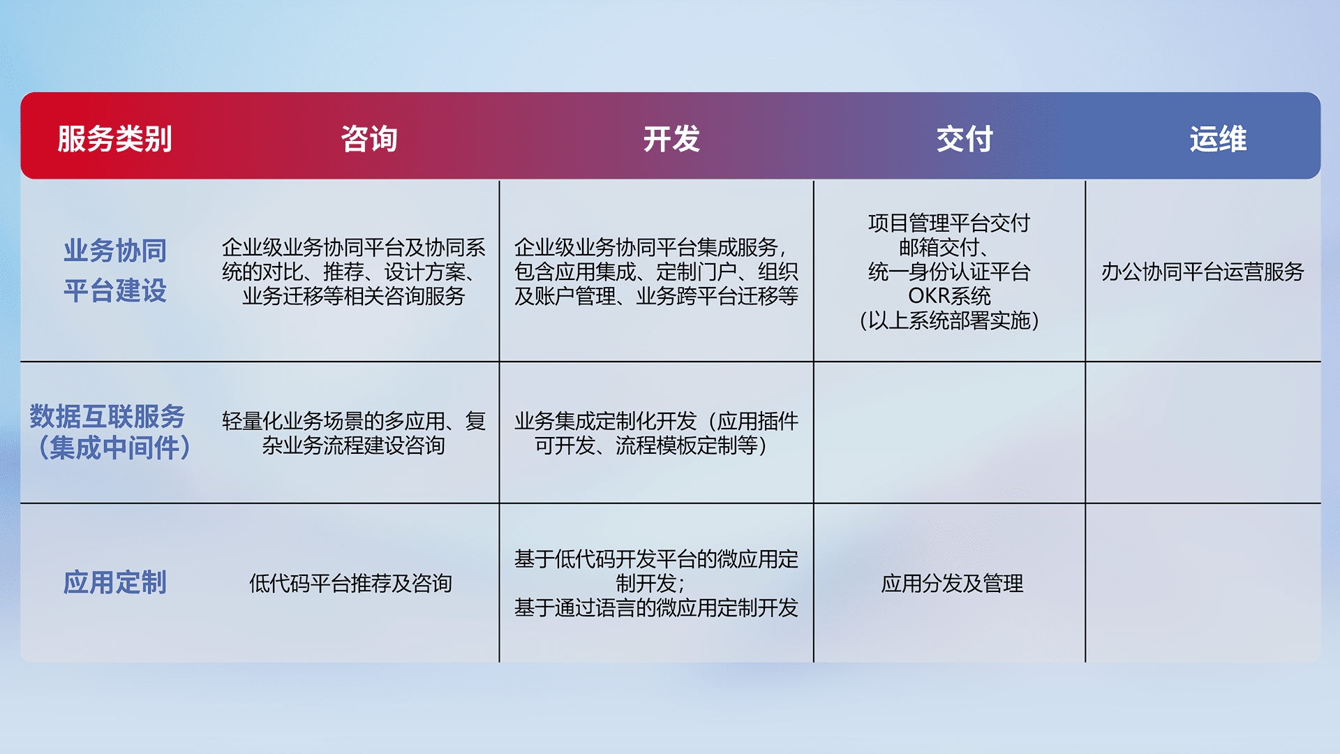 针对钉钉、、、、企微、、、、IDaas等平台级产品提供产品的规划、、、方案、、、、交付、、、、定制化开发等服务,,,,实现如统一协同办公、、、智能客户服务、、混合会议管理、、、、智能数据查询、、等业务场景,,实现数字化转型。。。